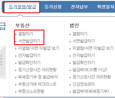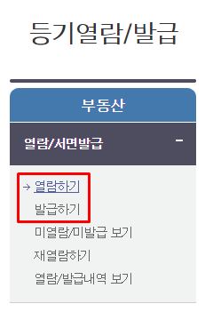 위 사진을 참고하면 쉽게 찾을 수 있을 것입니다. 왼쪽 사진은 메뉴바에서 찾는 방법입니다. 오른쪽 사진은 메인 페이지의 중간에 있는 아이콘을 참고로 하여 기능을 찾는 방법의 예시 사진입니다. 해당 기능을 선택하면 '등기열람/발급' 페이지로 이어지게 됩니다. 왼쪽 사이드바에서 열람하기 혹은 발급하기 등의 메뉴를 선택할 수 있습니다.