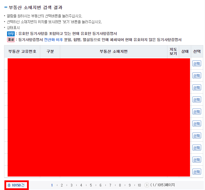 '부동산 소재지번 검색 결과'에서 원하는 물건을 찾은 후, 오른쪽에 있는 선택버튼을 클릭합니다.