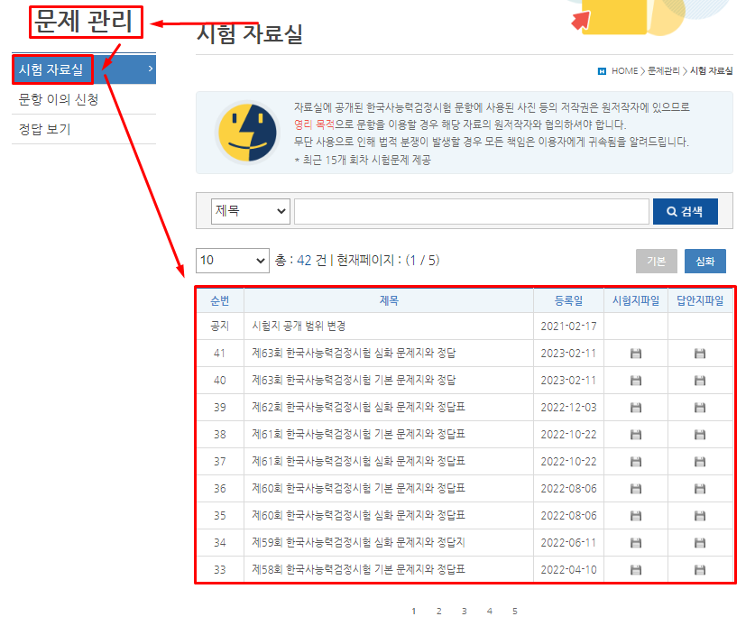 공식홈페이지에서는 기출 문제에 대한 정보도 제공하고 있습니다. 메뉴에서 '문제관리'를 살펴봅니다. 문제 관리 메뉴에는 '시험 자료실', '문항 이의 신청', '정답 보기' 기능을 제공하고 있습니다. 우리가 원하는 기출문제에 대한 정보는 '시험 자료실'에서 찾아볼 수 있습니다.