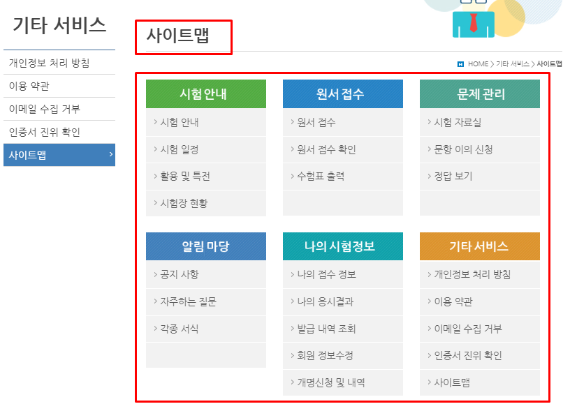 공식 홈페이지에서 지원되는 것은 크게 2가지로 구분할 수 있습니다. 시험 응시 및 결과 확인에 관련된 사항이 있습니다. 다음으로, 시험에 관련된 다양한 정보(공지사항 포함)가 있습니다. 즉, 기능과 정보로 구분할 수 있는 부분이기도 합니다. 처음 홈페이지를 방문하면 여러 기능 때문에 혼란스러울 수도 있습니다. 원하는 기능 혹은 정보를 찾기 위해서는 안내되는 메뉴에서 찾는 방법을 알아두면 도움이 될 수 있습니다.
