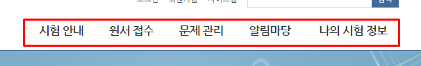 다른 메뉴 활용방법으로는 상단에 있는 메뉴바를 이용하는 방법이 있습니다. 메뉴바에는 '시험 안내, 원서 접수, 문제 관리, 알림마당, 나의 시험 정보'에 대한 큰 카테고리로 분류되어 있습니다.