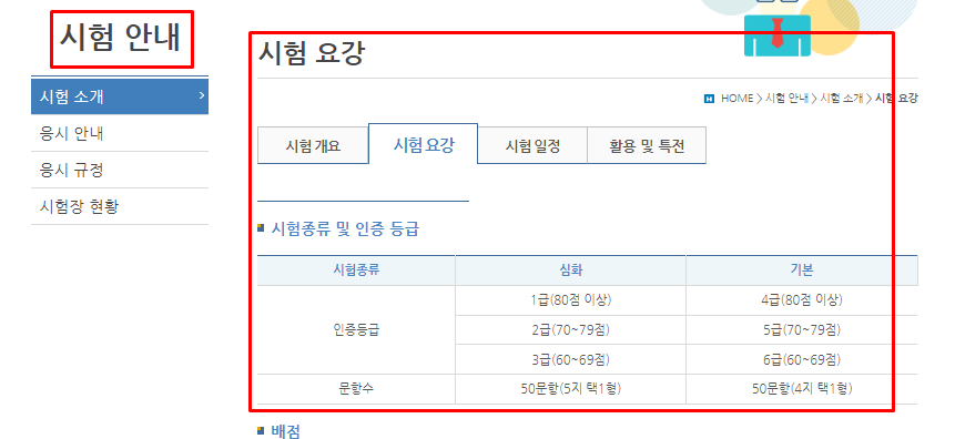 - 시험 안내 > 시험 소개 > 시험 요강 : 한국사검정능력시험 급수 정소.