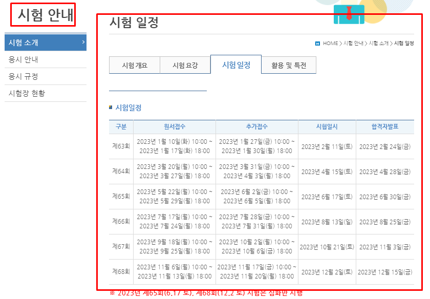 시험에 대한 기본적인 정보를 확인하는 메뉴는 '시험 안내'에서 찾을 수 있습니다. '시험 안내'에는 '시험 소개, 응시 안내, 응시 규정, 시험장 혀황'으로 세분화되어 정보를 제공하고 있습니다. 여기서 원하는 시험 일정 및 급수에 대한 정보는 '시험 소개'의 '시험 요강', '시험 일정'에서 찾을 수 있습니다.