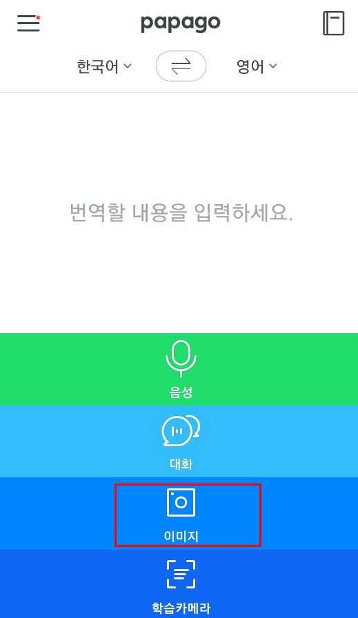 파파고 어플리케이션을 스마트폰에 설치합니다. 플레이 스토어에서 찾을 수 있습니다. 해당 번역기를 실행하면 기본 번역할 내용 입력 부분 아래에 음성 / 대화 / 이미지 / 학습카메라의 기능이 크게 보입니다. 여기서 '이미지'를 선택하면, 파파고 이미지 번역기를 사용할 수 있습니다.