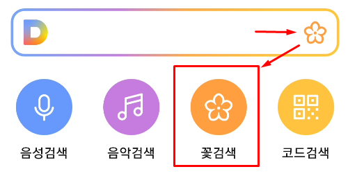 위 사진과 같이 음악검색 / 음성검색 / 꽃검색 / 코드검색 중 꽃검색 기능을 선택하여, 카메라를 통해 꽃이름을 찾을 수 있습니다. 외부에서 살아있는 꽃의 모습을 통해 이름을 찾을 수도 있지만, 인터넷 상에서 발견한 이미지의 꽃 이름도 카메라를 통해 인식하여 찾을 수 있습니다.