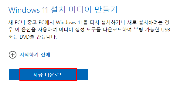 Step3. Windows 11 설치 미디어 만들기에서 '지금 다운로드' 선택
